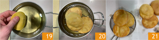 Verwarm de plantaardige olie tot een temperatuur van 160 -170 C en dompel 2-3 rondjes tegelijk onder 19. Na een minuut of twee kleuren ze aan één kant goudbruin; draai ze om en frituur nog ongeveer 2 minuten. Laat uitlekken 20 en leg op keukenpapier om overtollig vet te verwijderen 21.