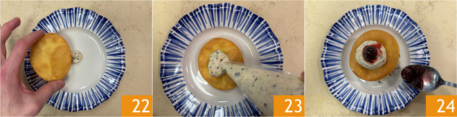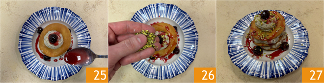 Je bent klaar om op te maken: knijp een klein toefje crème in het midden van het bord en leg daar een koekje op 22. Vul het koekje met crème 23 en herhaal totdat je in totaal 3 koekjes hebt. Voeg ook bovenop een toefje crème toe en garneer met de amarene in siroop 24.