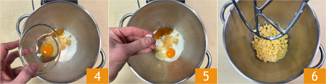 Voeg een ei toe 4, een snufje zout 5 en zet de machine met de platte klopper aan totdat je een deeg met een korrelige structuur krijgt 6.