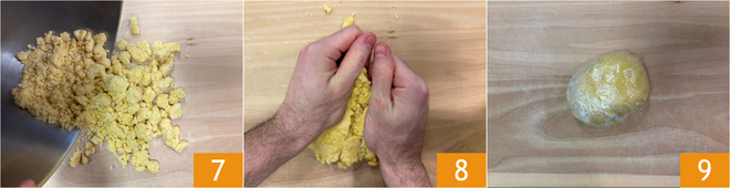 Verplaats het deeg naar het werkvlak 7 en kneed met de hand 8 totdat je een glad, homogeen bolletje krijgt. Dek af met folie 9 en laat 30 minuten rusten in de koelkast.
