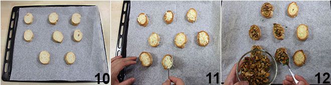 Leg de sneetjes brood op een bakplaat 10, zet de grill aan en bak ze ongeveer een minuut tot ze geroosterd zijn. Leg op elk crostini wat gruy e8re 11 en laat nog een minuut gratineren; schep daarna een eetlepel cantharellen op elk sneetje brood en u bent klaar om uw crostini met cantharellen en gruy e8re te serveren.