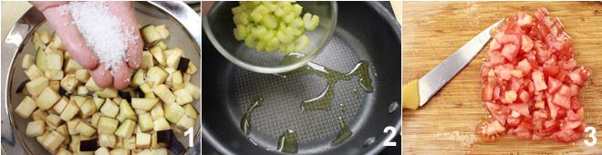 Was de aubergines en snijd ze in kleine blokjes en leg ze in een vergiet, bestrooi ze met grof zout. Laat ze ongeveer een uur zo rusten zodat ze hun vocht verliezen 1. Snijd ondertussen de selderijstengels in dunne reepjes en blancheer ze in gezouten water; giet af, droog ze en laat ze zachtjes fruiten in de olie 2. Snijd de ui in plakjes en de tomaten in blokjes 3.