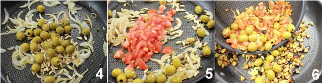 Verhit in een pan de ui in de olie en zodra deze geslonken is, voeg de kappertjes, de pijnboompitten en de olijven toe en laat alles ongeveer 10 minuten bakken 4. Voeg nu de tomaten toe 5 en laat 20 minuten op hoog vuur koken. Laat de aubergineblokjes uitlekken en spoel ze af, zorg ervoor dat je ze met keukenpapier goed droogdept. Verhit daarna in een anti-aanbakpan wat olie en bak de aubergineblokjes tot ze goudbruin zijn. Voeg de selderijstengels en het tomatenmengsel toe en meng alles goed door elkaar 6. Strooi nu de suiker en de azijn erover en laat nog op matig vuur koken totdat de azijn volledig is verdampt. Zodra de bereiding klaar is, schep je de caponata op de vellen en bestrooi je het geheel met vlokjes gezouten ricotta.