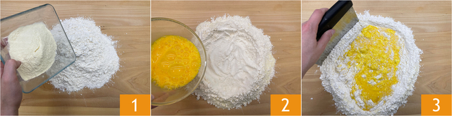 Om de cappellacci gevuld met pompoen en amaretti op provola‑fondue te maken begin je met het eierdeeg: strooi op je werkblad de bloem en de semolina 1, maak een kuiltje en breek de eieren in het midden 2. Begin de bloem door de eieren te mengen met een vork of een deegkrabber 3.