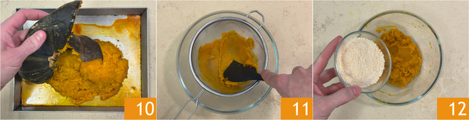 Bak in een voorverwarmde oven op 200°C in het hete lucht‑ of het gewone oventrapje gedurende ongeveer 45 minuten. Als de pompoen zacht is, verwijder je de schil 10 en stamp je het vruchtvlees; voor een gladde, romige textuur kun je het door een zeef wrijven 11. Voeg de geraspte kaas toe 12.