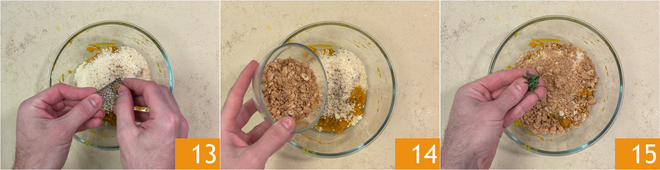 Voeg ook geraspte nootmuskaat toe 13, de verkruimelde amaretti 14 en de blaadjes tijm 15.