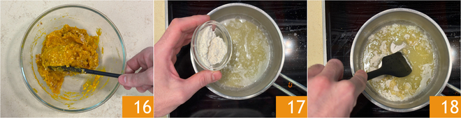 Meng goed door elkaar, schep de vulling in een spuitzak en zet die ongeveer twintig minuten in de koelkast 16. Maak ondertussen de fondue: smelt de boter in een steelpannetje en voeg dan de bloem toe 17. Roer goed met een spatel en let erop dat de bloem niet verbrandt; dit duurt een paar minuten 18.