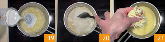 Als de bloem geroosterd is, giet je beetje bij beetje de melk erbij 19 en blijf je zachtjes roeren op laag vuur 20. Zodra het begint te pruttelen, voeg je de geraspte gerookte provola toe 21.