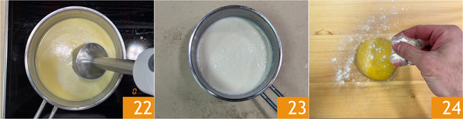 Roer totdat de kaas volledig is gesmolten, haal de pan van het vuur en pureer eventueel met een staafmixer 22 om een gladde, goed smeuïge fondue te krijgen 23. Pak het deeg terug en bestuif het licht met bloem 24.