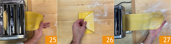 Rol het deeg uit met een pastamachine, begin bij de breedste stand van de rollen 25 en maak de stand geleidelijk dunner, vouw het velletje tussen de doorgangen door om het te verstevigen 26. Ga zo door totdat je een dikte van ongeveer 1–1,5 mm bereikt 27.
