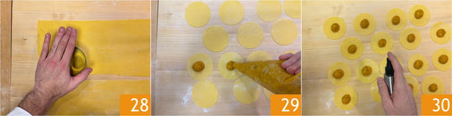 Steek met een uitsteker van 7–8 cm diameter rondjes uit 28; met deze hoeveelheden krijg je ongeveer 24 stuks; je kunt de restjes opnieuw kneden en opnieuw uitrollen na de rusttijd. Spuit een toefje pompoen‑amaretti‑vulling in het midden van elk rondje 29. Besprenkel heel weinig water op de randen om het sluiten te vergemakkelijken 30.