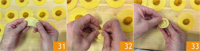 Vouw de rondjes tot halve manen 31, draai daarna de uiteinden zodat ze op elkaar aansluiten en knijp ze samen vast 32. Als alle cappellacci gevormd zijn, kook je ze in gezouten water op een zacht kokende temperatuur voor een paar minuten 33.