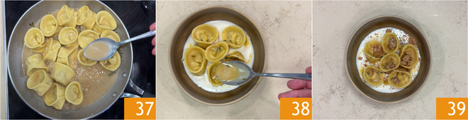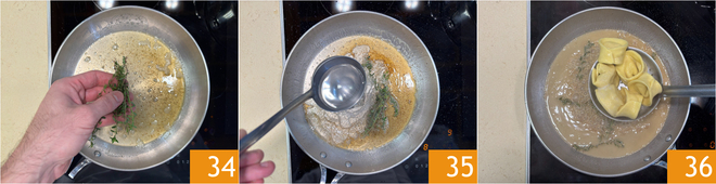 Maak ondertussen de dressing: smelt de boter in een pan op laag vuur; zodra hij een mooie hazelnootkleur krijgt voeg je de tijm toe 34 en een scheutje van het pastawater 35. Schud de pan licht om de saus te emulgeren en romig te maken. Giet de cappellacci af en schep ze in de pan met de saus 36.