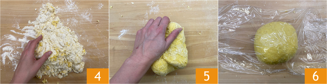Wanneer het mengsel meer samenhang krijgt, ga je verder met het kneden met de hand 4 totdat het deeg compact wordt 5. Wikkel het in huishoudfolie en laat het ongeveer een halfuur rusten op een koele plek 6.