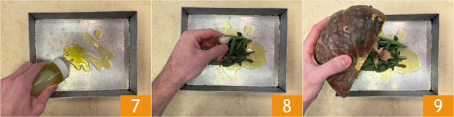 In de tussentijd maak je de vulling klaar: giet wat olie op een bakplaat 7, leg een hoopje salieblaadjes en de teentjes knoflook erop 8. Leg de halve, van zaden ontdane pompoen met de snijkant naar beneden zodat de aroma's in de holte trekken 9.