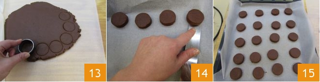 Als de gewenste dikte is bereikt, neem dan een uitsteker van 4-5 cm diameter en steek rondjes uit het deeg 13. Leg de zo verkregen koekjes op een bakplaat bekleed met bakpapier. Om ze te verplaatsen kun je een spatel gebruiken 14 om te voorkomen dat je vingerafdrukken aan de zijkanten of op het oppervlak van de koekjes achterlaat. Bak de koekjes in een voorverwarmde conventionele oven op 180°C gedurende 13 minuten (als je een heteluchtoven gebruikt kun je ze op 160°C bakken voor 5–6 minuten) 15. Je kunt tijden en temperatuur voor jouw oven testen door een eerste baksel met slechts een paar koekjes te bakken.