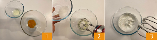Om de tiramisù van colomba te bereiden, scheid je de dooier van het eiwit 1. Voeg in de kom met het eiwit de helft van de suiker toe 2 en klop halfstijf met een elektrische mixer 3.