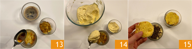 Stel in 4 glazen van 200 ml op deze manier samen: leg op de bodem een colomba-schijfje, de koffie (ongezoet of naar smaak gezoet) 13, een flinke lepel mascarponecrème 14 en een beetje fijngehakte chocolade. Ga verder met de tweede laag: begin met een colomba-schijfje 15.