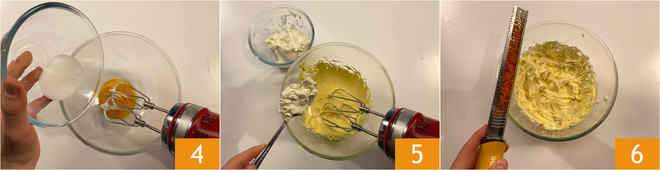 Doe hetzelfde met de dooier: voeg de andere helft van de suiker toe en klop met de elektrische mixer 4 tot een licht en schuimig mengsel. Voeg de mascarpone beetje bij beetje toe terwijl je blijft mixen 5. Breng op smaak met geraspte sinaasappelschil 6.