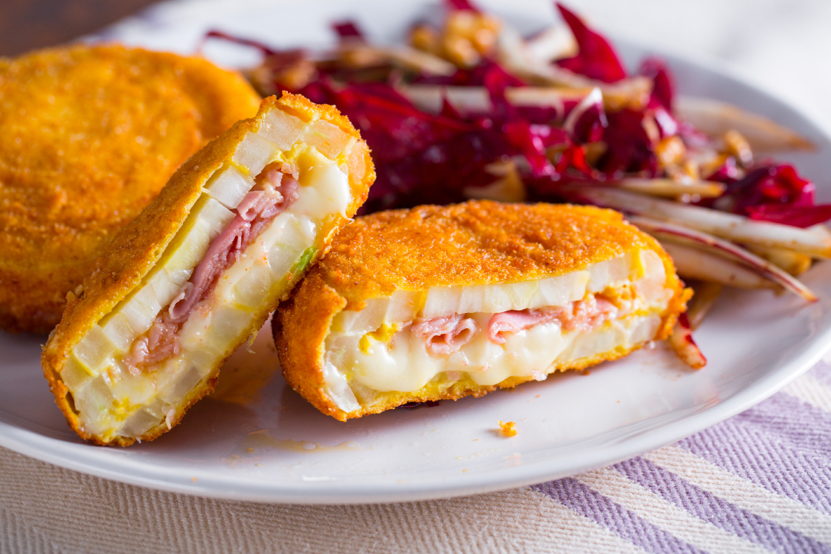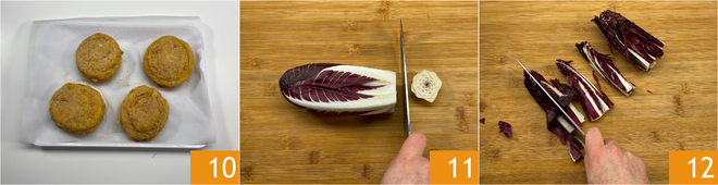 Vorm met je handen zodat ze hun vorm behouden en leg de cordon bleu op een schaal bekleed met bakpapier. Ga op deze manier door om alle andere te maken; met deze hoeveelheden krijg je er 4 10. Maak de bijgerechten-salade: verwijder de buitenste bladeren van de radicchio en haal de kern eruit 11, halveer hem en snijd hem in zoveel partjes als je kunt krijgen 12.