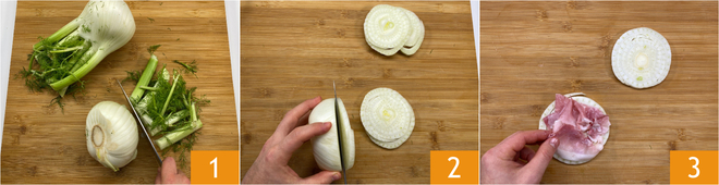Om de venkel-cordon bleus te maken, begin je met het schoonmaken van de venkel: verwijder het groene gedeelte 1 en snijd ze dwars in plakken zodat je 4 paar schijven krijgt die min of meer even dik zijn 2. Snijd ook de edam in gelijkmatige plakjes. Leg een plak ham op een venkelschijfje 3.