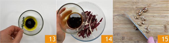 Maak een emulsie van olie, balsamicoazijn, blaadjes tijm, zout en peper 13. Breng de radicchio op smaak met de emulsie 14. Hak de walnoten fijn 15.
