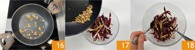 Rooster de walnoten in een koekenpan 16, voeg ze vervolgens toe aan de salade 17 en meng 18.