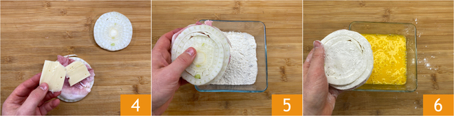 Voeg een laag kaas toe 4 en sluit af met nog een plak venkel. Haal het geheel eerst door de bloem 5 en daarna door de eieren, losgeklopt met melk 6.
