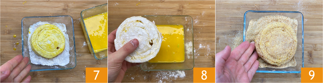 Haal de cordon bleu nogmaals door de bloem 7 en door de eieren 8, en bedek hem tenslotte met paneermeel 9.