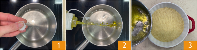 Om de couscous met groenten en tonijn te bereiden giet je allereerst het water in een steelpan, voeg je het zout 1 en de olie 2 toe en breng je aan de kook. Doe de couscous in een schaal of op een brede schaal en giet er het kokende water overheen 3.