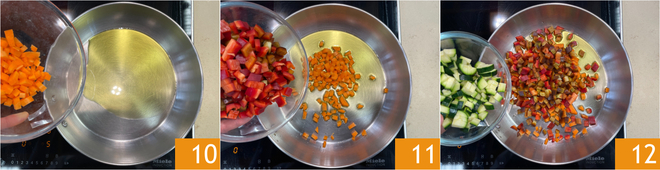 Verhit een scheutje olie in een koekenpan, voeg de wortels toe 10 en bak 4 minuten op middelhoog vuur. Voeg vervolgens de paprika's 11 en de courgettes 12 toe.