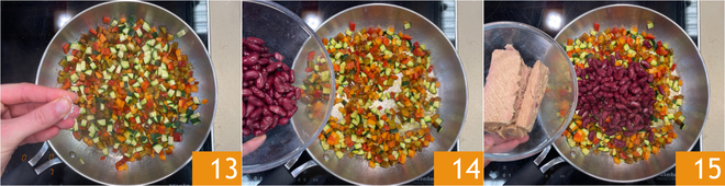 Breng op smaak met zout 13 en blijf nog ongeveer 10-15 minuten bakken. Haal de pan van het vuur en voeg de kidneybonen 14 en de tonijn 15 toe.