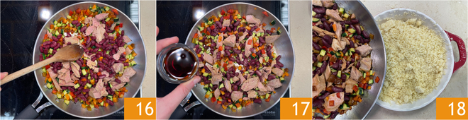 Meng alles goed door elkaar en verkruimel de tonijn met een pollepel 16. Breng op smaak met sojasaus 17 en meng opnieuw. Op dit punt kun je de couscous erbij doen 18.