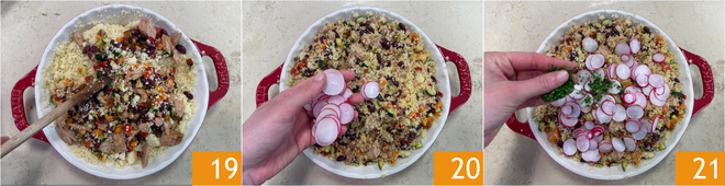 Roer alles goed door elkaar 19 en werk af met de rauwe radijsjes 20 en de fijngehakte peterselie 21.