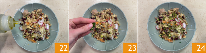 Schep op en garneer met een scheutje olie 22 en nog wat fijngehakte peterselie 23. Je couscous met groenten en tonijn is klaar om te worden opgediend 24!