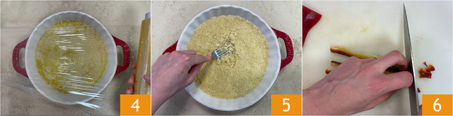 Dek af met plasticfolie 4 en laat 2 minuten staan. Controleer op de verpakking van de couscous hoeveel water je moet gebruiken en hoelang de rusttijd is. Zodra de aangegeven tijd verstreken is, maak je de couscous los met de tanden van een vork 5 en zet je hem opzij. Ga verder met de groenten: verwijder de steelaanzet, de zaadjes en de binnenste vliezen van de paprika, snijd hem eerst in partjes, daarna in reepjes en uiteindelijk in kleine blokjes 6.
