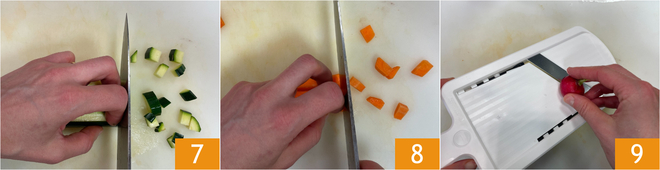 Doe hetzelfde voor de courgettes 7 en de wortels 8. Snijd de radijsjes met een mandoline in dunne plakjes 9.