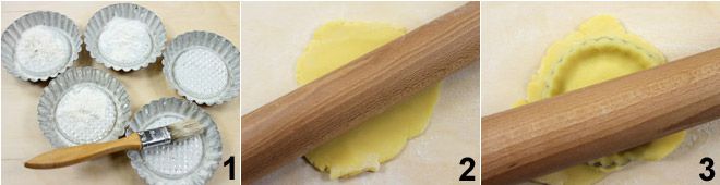 Boter en bebloem 6 taartvormpjes met een diameter van ongeveer 8 cm elk 1. Na de rustperiode in de koelkast, rol het zanddeeg uit tot een dikte van ongeveer 3 mm met behulp van een deegroller 2, snijd het in vierkanten van ongeveer 10 cm en plaats elke vierkant op de taartvormpjes en druk het goed aan op de bodem en de zijkanten van de vormpjes. Verwijder uiteindelijk het overtollige deeg met behulp van een deegroller 3.