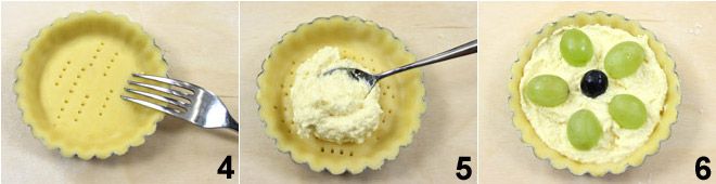 Prik vervolgens met de tanden van een vork gaatjes in de bodem van de taartjes 4 en plaats op elk een royale eetlepel frangipane crème 5, die u vervolgens met de achterkant van dezelfde lepel zult gladstrijken. Was de witte druiven en snijd de druiven doormidden (verwijder indien aanwezig de pitjes). Plaats de helften van de druiven op de frangipane crème, waardoor de bloemblaadjes van een bloem worden gevormd. Plaats in het midden van elke bloem een kleine zwarte druif 6.