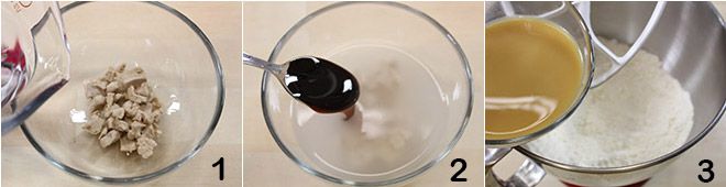 Om de ciaccia met druiven te maken, begint u met het bereiden van het brooddeeg: los de gist op in een beetje lauwwarm water 1 (genomen uit de totale hoeveelheid water die voor het recept is voorzien) en voeg een theelepel mout toe (of suiker of honing) 2, meng dan alles en laat het een paar minuten rusten. Doe de gezeefde bloem in een keukenmachine, voeg het gistmengsel, water en mout toe 3