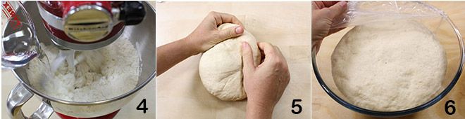 en begin te kneden met de haak, voeg de resterende water geleidelijk toe 4. Wanneer je een gladde en zachte consistentie hebt verkregen, typisch voor brooddeeg, leg het mengsel dan op een met bloem bestoven werkblad en kneed het kort met de hand 5. Vorm een bal en doe deze in een kom, afgedekt met folie (of een schone, vochtige theedoek), en laat het dan een paar uur rijzen in de oven, uitgeschakeld en gesloten maar met het licht aan: het deeg moet in volume verdubbelen 6.
