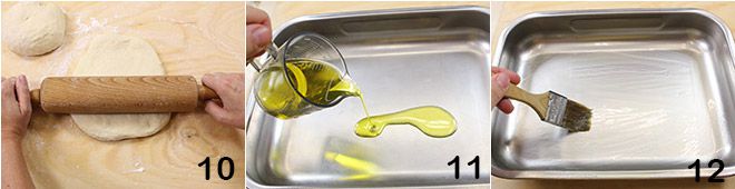 Verdeel nu het brooddeeg in twee delen en rol ze beide uit met behulp van een deegroller, tot een dikte van 1 cm 10. Vet een bakplaat van 40 x 30 cm in 11, met behulp van een kwast 12,