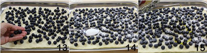 leg dan een lap deeg neer en bedek het volledig met de helft van de totale hoeveelheid druiven 13, een eetlepel suiker 14 en extra vergine olijfolie 15.