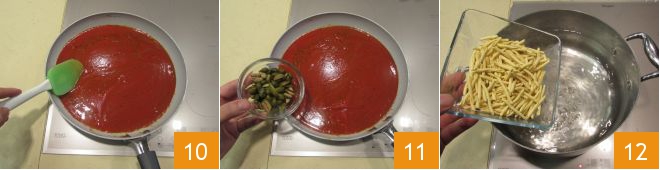 Roer alles door elkaar 10 en laat het ongeveer tien minuten koken, voeg dan ook de kappertjes toe 11. Intussen kook je de strozzapreti 12.