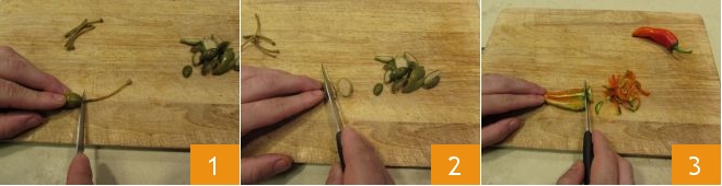 Om de duivelse strozzapreti te bereiden, begin je met het afspoelen van de kappertjes onder stromend water en verwijder dan de steeltjes van de vruchten 1, snijd de grotere kappertjes in plakjes 2 en laat de kleinere heel. Spoel de chilipepers af, verwijder de stengel en snijd ze in reepjes 3.
