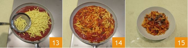 Giet ze goed al dente af en doe ze direct in de pan 13 waar je ze samen met de saus verder laat koken 14. Serveer je duivelse strozzapreti 15 en serveer ze heet!