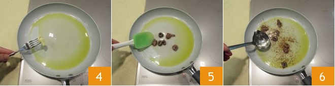 Zet op dit punt een pan met licht gezouten water op het vuur dat nodig is voor de bereiding van de pasta en bereid de saus: giet de olie in een ruime koekenpan, voeg de knoflook toe en laat het goudbruin worden. Verwijder het dan 4 en voeg de ansjovisfilets toe die uit de bewaarolie zijn gehaald 5. Laat ze een paar minuten bakken en voeg een soeplepel water toe 6.