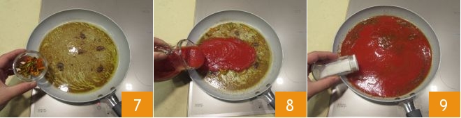 Blijf koken tot de ansjovis bijna volledig zijn opgelost en voeg de chilipeper toe 7. Voeg ook de tomatenpassata toe 8 en breng op smaak met zout 9 en peper.