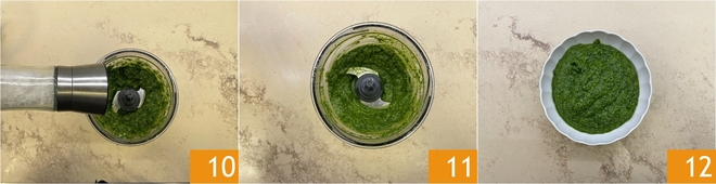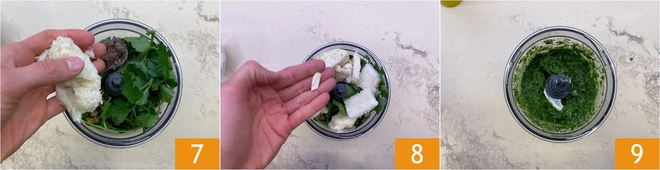 Voeg tenslotte het uitgeknepen brood toe 7 en het teentje knoflook 8 en mix enkele seconden 9.