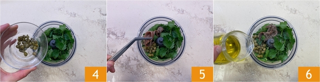 Voeg de ontzoute kappertjes toe 4, de ansjovis in olie 5 en de olie 6.